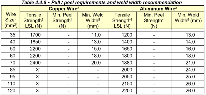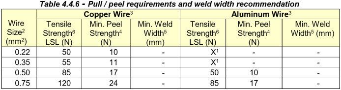 電池的正極材料為鋁,所以檢測線基本為銅線焊接到鋁片上,對于這樣的應用可以認為為鋁銅連接,拉力撕拉力應參照鋁線焊接,按USCAR38-1標準,0.22﹑0.35 mm2線的標準是缺失的。具體可以參照我司楚鑫sonictech的企業(yè)標準。